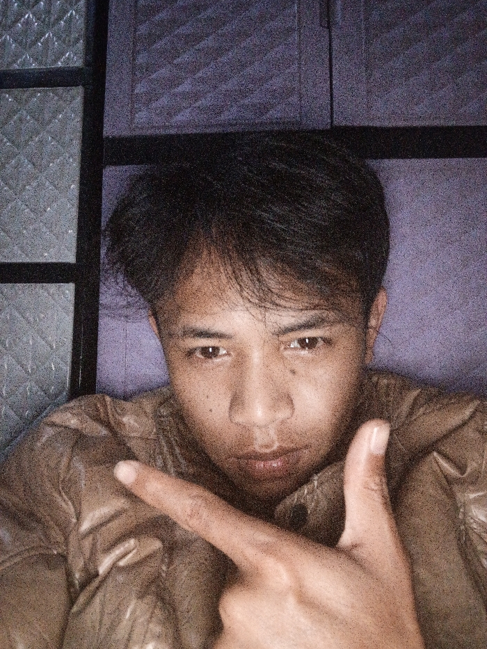 This image captures a male individual indoors in Pacet, Indonesia. The subject, appearing to be a young male with dark hair and a neutral expression, occupies the majority of the frame, gazing directly forward. He is clad in a light brown or tan puffer jacket. His right hand is raised, with the index finger extended horizontally, pointing to the left side of the frame from the viewer's perspective, and the thumb also extended upwards. The background on the left side features a section of a dark-framed window or partition with textured, translucent glass. The background on the right is a muted purple or dark grey-blue wall or panel, showing faint horizontal structural lines. The scene is dimly lit, contributing to visible image noise.