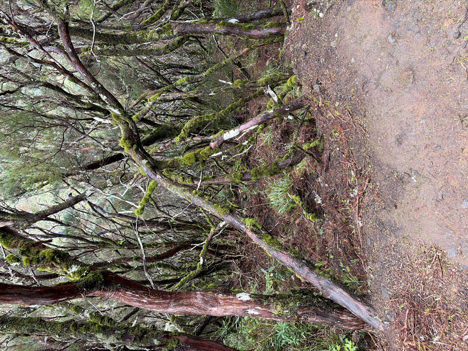 The image displays a dense woodland scene located in Calheta, Portugal. The foreground and midground are dominated by numerous trees featuring gnarled, interwoven branches and trunks, many exhibiting reddish-brown bark with occasional lighter patches. Abundant bright green moss covers the bark and branches of most visible trees. The forest floor is primarily composed of reddish-brown soil, a clear dirt path occupies the lower right, and scattered organic debris such as fallen leaves and needles is interspersed with sparse green undergrowth. No individuals or artificial structures are present within the frame.