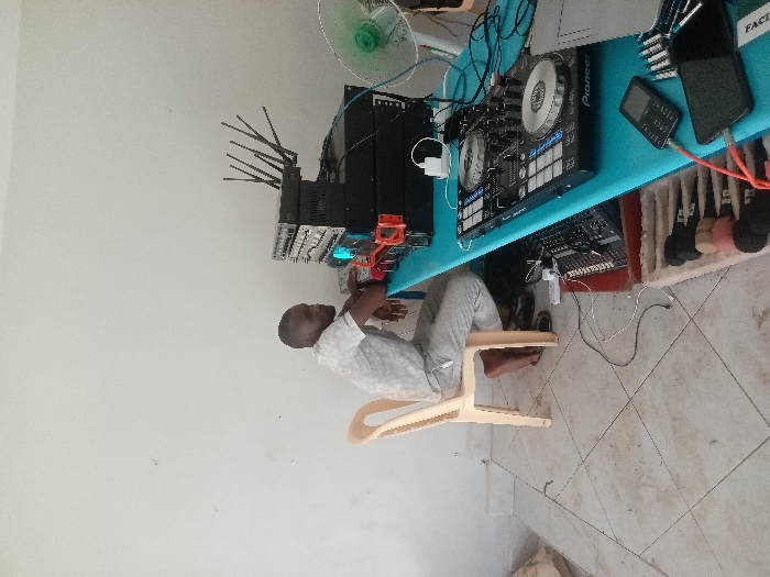 The image displays an indoor scene located in Kinondo ward, Kenya. One dark-skinned adult male, with short hair and a beard, is seated on a light-colored plastic chair. He wears a light-patterned short-sleeved shirt and matching long pants, with bare feet resting on a light-tiled floor. His forearms are positioned on a bright blue table surface, with hands near the equipment. The table features a stack of black rack-mounted audio equipment, including units with blue LED indicators and a top unit equipped with multiple antennae. An orange plastic bracket supports a section of this stack. To the right, a light green desk fan is present. A black Pioneer brand DJ controller, featuring two jog wheels, buttons, and faders, occupies the table's right side. Adjacent items include a smaller black audio mixer, a black feature phone, and a black smartphone connected by an orange cable. Multiple audio jacks/adapters are situated on the far right of the table. Black and white cables are arranged on both the table and the tiled floor, connecting various devices, with a white power strip visible on the floor. A wooden tray containing several microphones, distinguished by black, pink, and beige foam windscreens, rests on the floor partially beneath the table in the foreground.