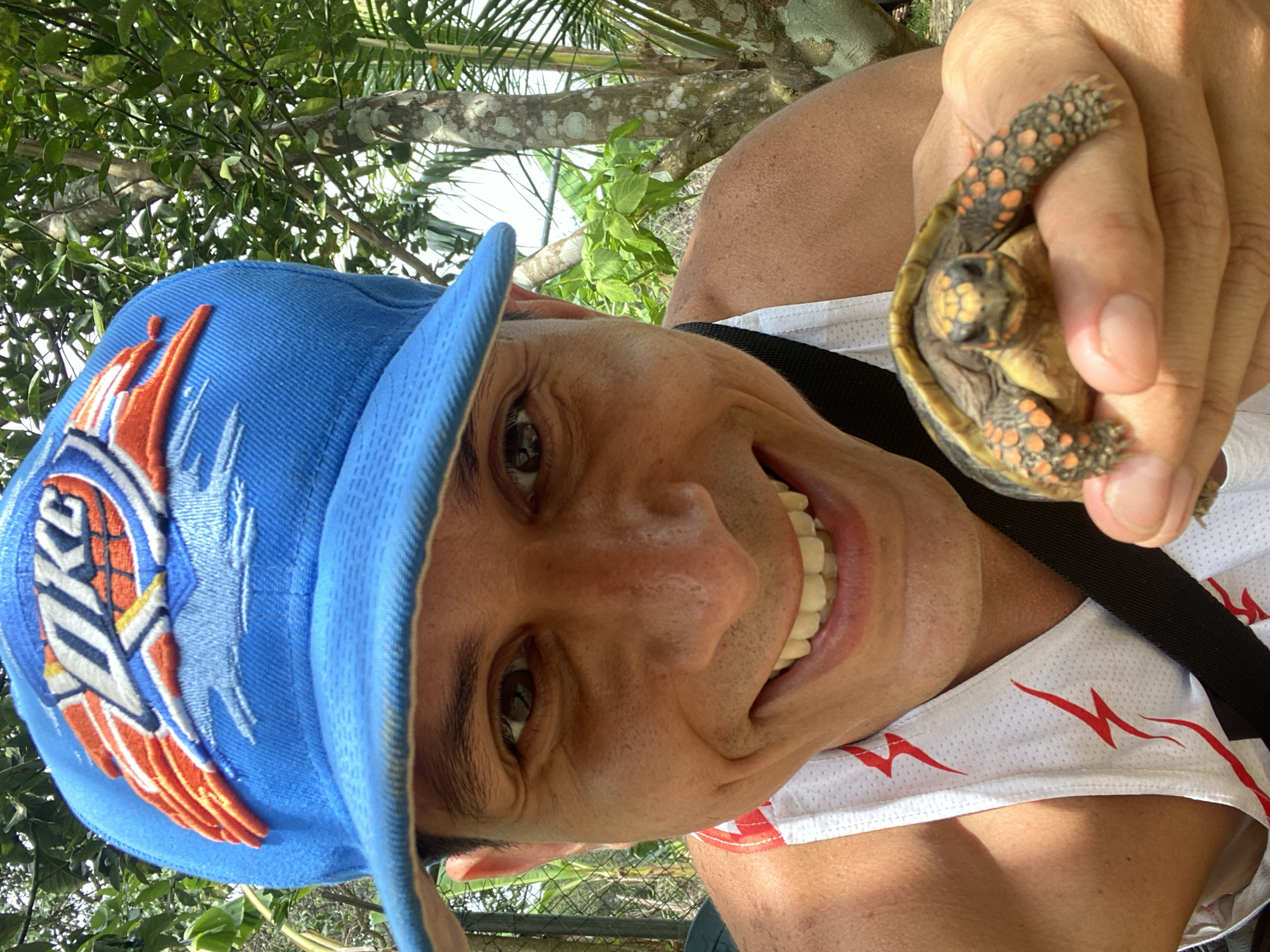 A man is holding a small turtle in his right hand. The man has light brown skin and is wearing a blue baseball cap with an orange and white logo. He is smiling broadly, showing his teeth. He is also wearing a white shirt with red lightning bolt designs. A black strap runs across his chest. The background consists of green foliage and tree branches. The location is likely Los Velásquez, Venezuela, based on the request.