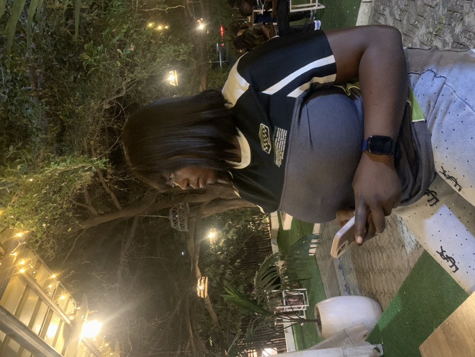 A woman is sitting at an outdoor table at night. She is wearing a black and white shirt with gray leggings that have a black pattern. She holds a cell phone in her hand. She has on a dark smart watch. The scene is surrounded by trees and decorative lighting. A potted plant sits on the table next to her.