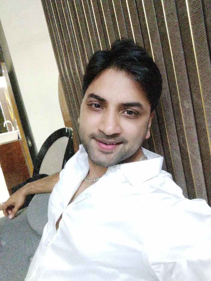 The image displays a close-up, chest-up selfie of an adult male captured indoors within a structure in Bidhannagar, India