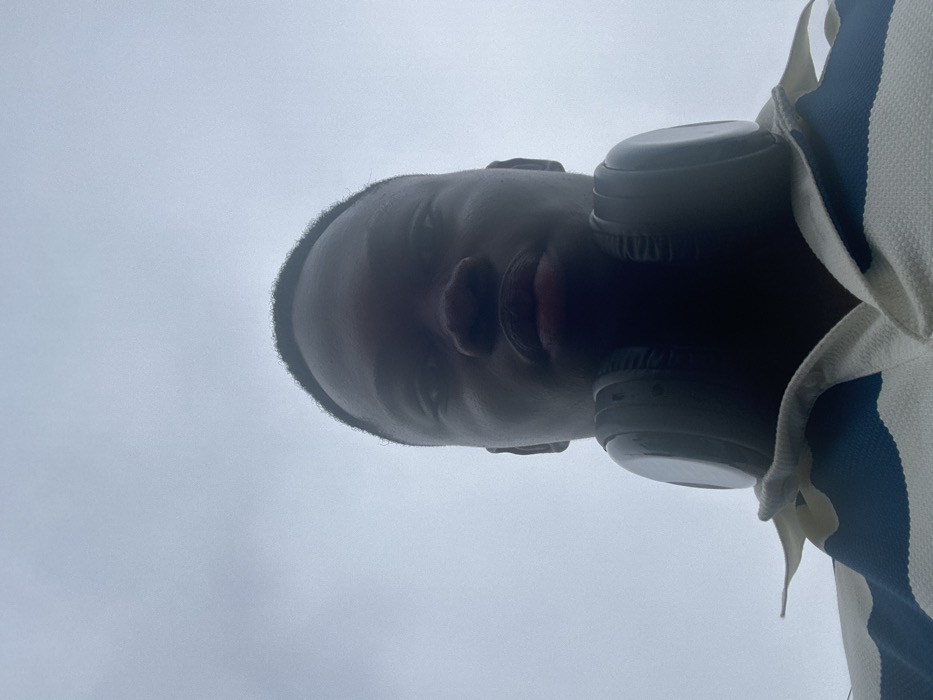 An individual looks upwards towards the camera. Wearing headphones, the person’s face is framed by the overcast sky. The camera angle is low, emphasizing the face against the backdrop. A collared shirt with blue and white stripes is visible on the right side of the frame. The person's expression is neutral.