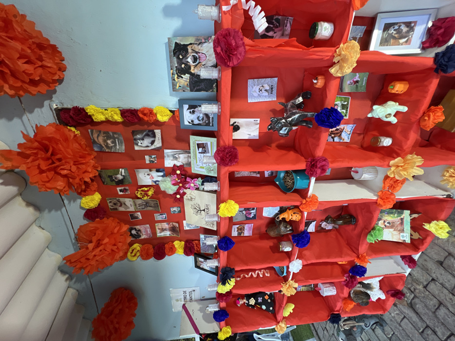 This image depicts a multi-tiered memorial display, likely an altar, situated in Casco Urbano, Colombia. The structure is predominantly red, positioned against a light blue wall, with a white corrugated roof visible above. The ground area is paved. The display is extensively decorated with paper pom-poms and garlands in orange, yellow, red, and blue hues. The upper section of the red backdrop is covered with numerous photographs of dogs, both framed and unframed, some explicitly named (e.g., BAMBU, ALASKA, TOBY, MOSS, MALINA). This area also features small artificial flower arrangements, framed artwork (including a tree motif), and clear glass votive holders. A white sign partially visible on the far left states "REGISTRO DE VISITANTES" (Visitor Register). The lower section comprises a shelving unit with open cubby-like compartments. Each compartment contains various objects, including additional dog photographs, dog figurines (such as a black geometric dog, a light green dog, and a brown dog), a teal bowl filled with kibble, assorted jars, small ceramic pumpkins, a doll dressed in black with colorful patterns, and candles in clear holders. No people are present in the scene.