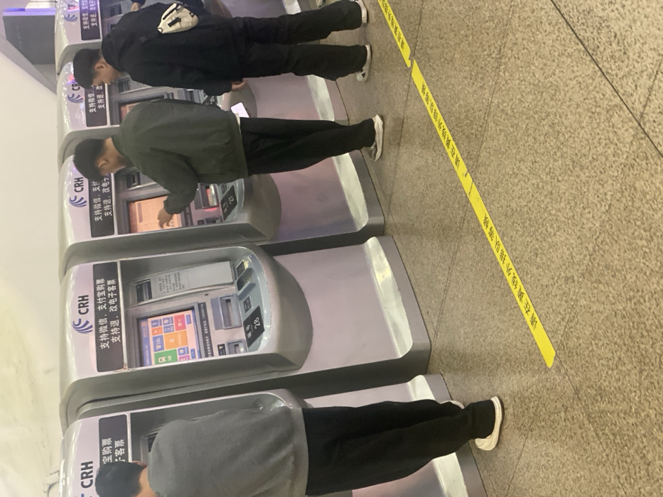 - "The scene depicts four adult males interacting with a row of self-service ticket machines in an indoor public transport facility, identified as a train station in Panyu District, China" by FM-ikS7J2, licensed under CC BY 4.0