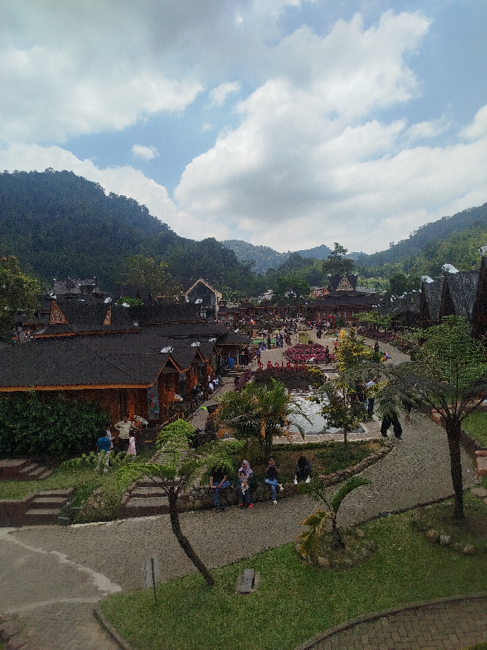 An elevated, wide-angle view depicts a cultural or tourist complex situated in a valley in Unknown, Indonesia. The foreground displays paved pathways, grassy inclines, and a group of approximately five individuals seated on a low stone wall to the right. The middle ground features numerous traditional Indonesian-style buildings with dark, multi-tiered, and distinctly pointed roofs, consistent with Minangkabau architecture. These structures, appearing to be primarily one-story and constructed from natural materials, line pedestrian pathways and surround a central, rectangular pond. The pond area is extensively landscaped with red and pink flower beds, various trees, and shrubs. Several hundred individuals, including adults and children, are distributed throughout the complex, engaged in walking along paths, gathering in open areas, and observing their surroundings. The background is dominated by lush, densely forested mountains under a sky exhibiting scattered white clouds. The scene conveys an active, well-maintained public space.