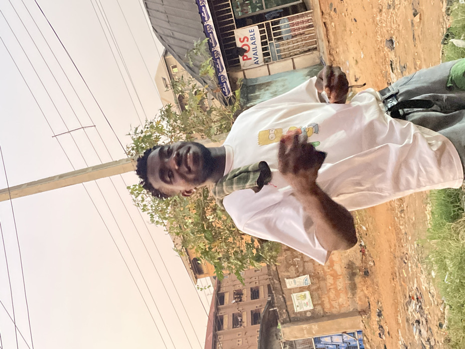 A smiling Black man in a white t-shirt with a Simpsons cartoon stands outside. He holds up one hand, seemingly greeting the viewer. Overhead electrical wires stretch across the sky. Behind him, a building with a "POS AVAILABLE" sign is visible. The setting is outdoors, near a street with litter along the side, and a building in the background appears to be under construction. The image is slightly rotated.