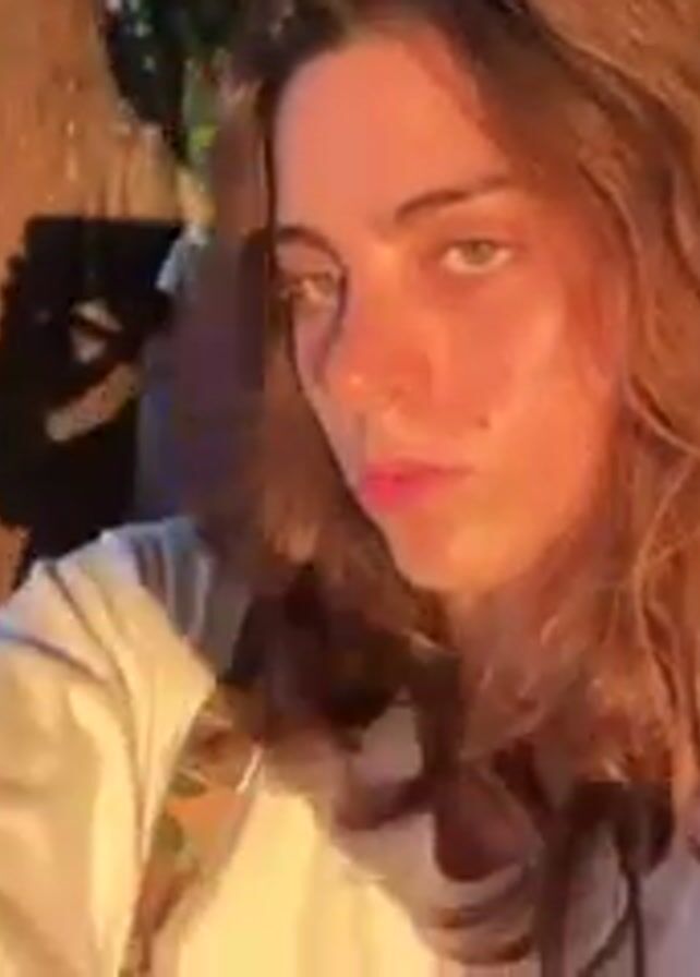 A woman with wavy brown hair is standing outdoors in a warm, golden light. She is wearing a white t-shirt and has what appears to be a strap or suspender over her shoulder. The camera angle is a selfie, looking slightly down. The video moves, showing other people around her, standing on what appears to be a stone or concrete surface. Their feet are visible; some are wearing sandals. The environment seems to be an outdoor gathering place, potentially a patio or yard, with trees and possibly buildings visible in the background.