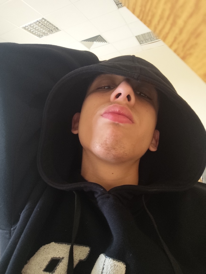 - "A close-up, upward-angled image depicts an individual, presumed male, wearing a black hooded sweatshirt" by FM-BskwX2, licensed under CC BY 4.0