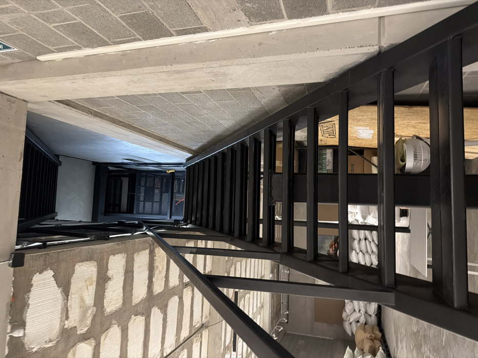 The image depicts an indoor industrial or commercial storage area, characterized by exposed building materials, located in the city of León, Mexico. A prominent, straight black metal staircase with railings ascends from the lower-left foreground towards the upper-middle background. The staircase features open risers and leads to an upper level with a dark metal mesh barrier. The ceiling consists of an exposed concrete slab with a grid of rough, lighter-colored rectangular panels or textured areas. The right wall is constructed from gray concrete blocks, with a smooth concrete pillar running vertically along its edge; a small green and white emergency exit sign is partially visible at the upper right. The floor below the stairs is concrete. In the area beneath and to the left of the staircase, multiple stacks of large, off-white or light brown sacks are present, piled on the floor. Partially visible objects include a white folding table, a white plastic item (possibly a fan base or basket), various cardboard boxes (one with "GIESEN" printed on it and another with "care"), and a large wooden board leaning against a wall. No individuals are present, and no actions or interactions are depicted.