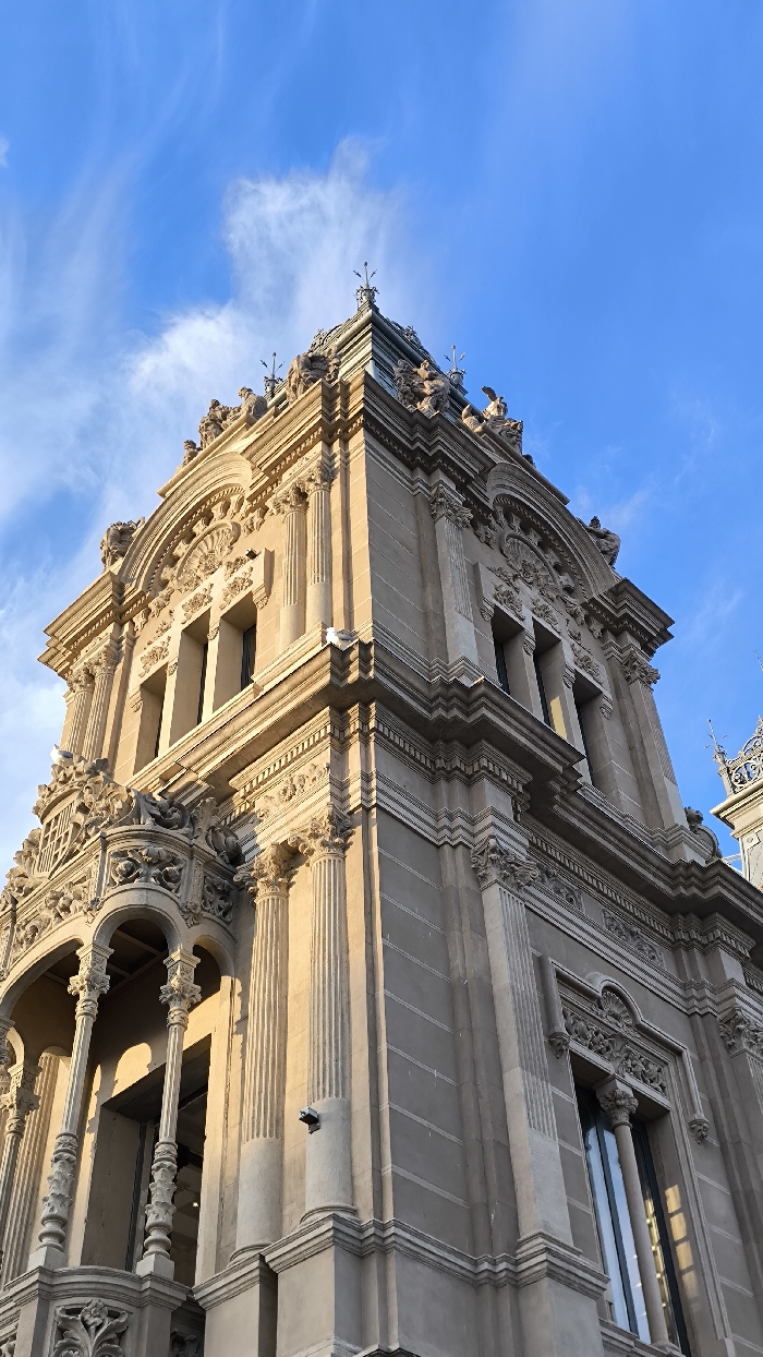 The architectural shot from a low angle captures a grand, ornate building. The structure features detailed carvings, columns, and arched windows. The building's facade is bathed in warm sunlight, contrasting with the blue sky dotted with wispy clouds. Sculptural elements crown the top of the building.
