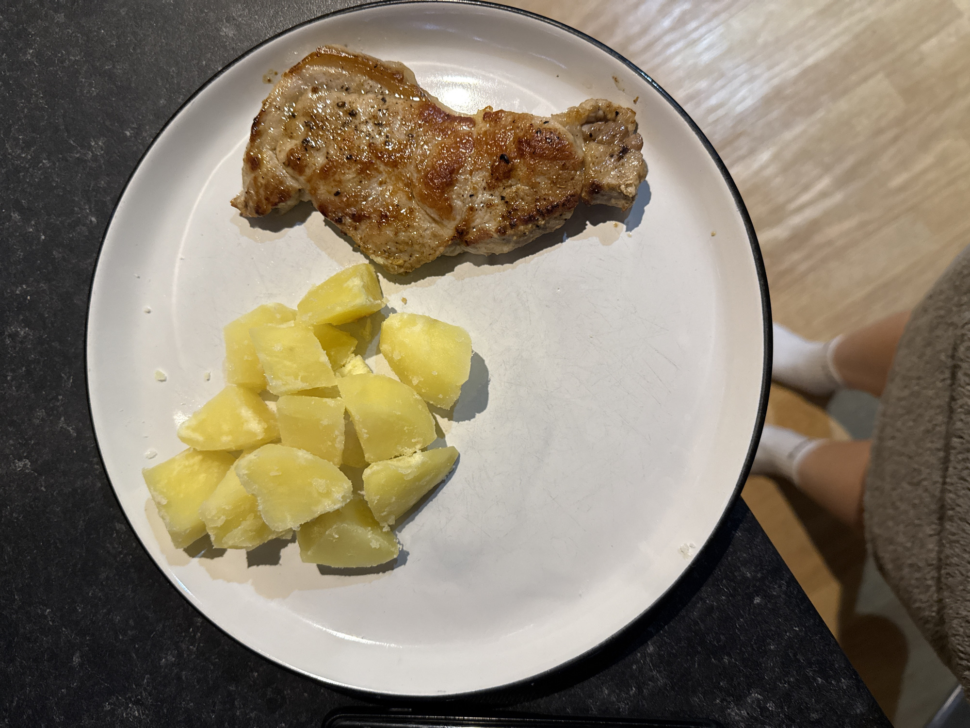 A white plate with a black rim holds a cooked pork chop and a pile of cooked, cubed potatoes. The plate is placed on a black countertop. In the background, a person's lower legs and feet in white socks are visible against a light-colored wooden floor. The location is not discernible from the image, but the image was taken in Great Yarmouth, United Kingdom.
