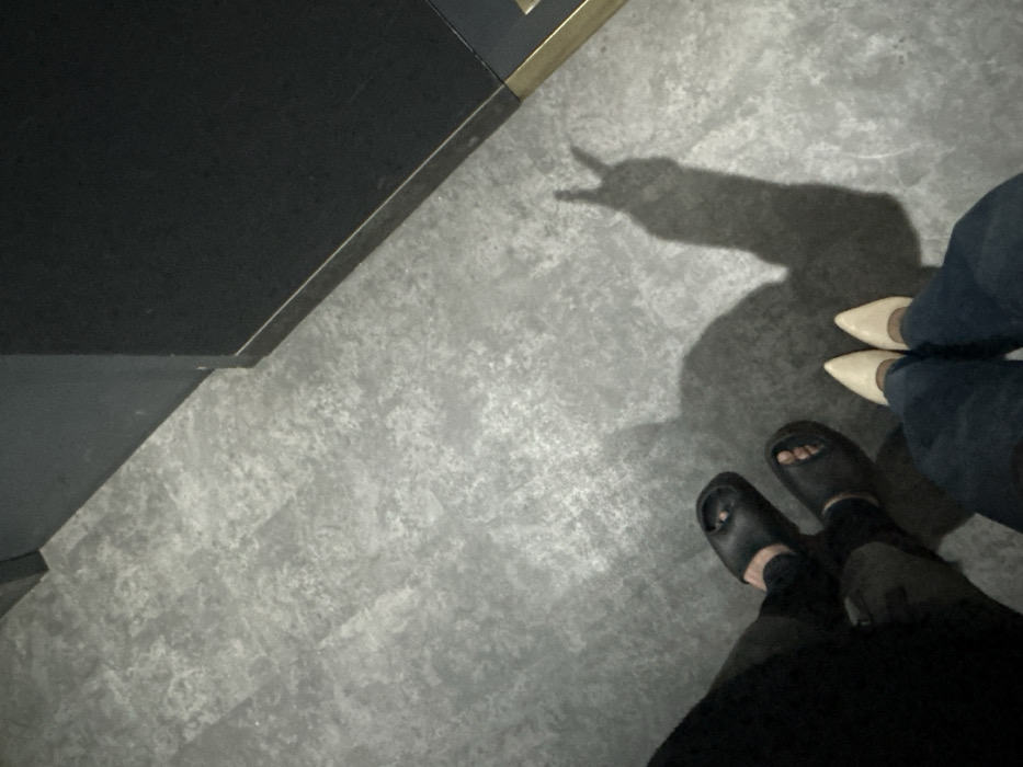 The scene, located in Bekasi, Indonesia, captures an overhead perspective of a grey, textured floor surface, likely polished concrete or large-format tiles. Two individuals are partially visible at the bottom of the frame. On the left, a person wears dark trousers and black open-toed slide sandals on both feet. To their right, a second person is clad in blue jeans and light-colored, pointed-toe flat shoes. A distinct shadow, originating from the second individual, projects onto the floor, clearly depicting a hand forming a V-sign (peace sign). The upper right quadrant of the image shows a dark, possibly black, vertical wall or structure with a thin, brass-colored strip running along its base and corner, indicating an interior architectural element. The lighting source, positioned to cast long shadows, suggests an indoor environment.