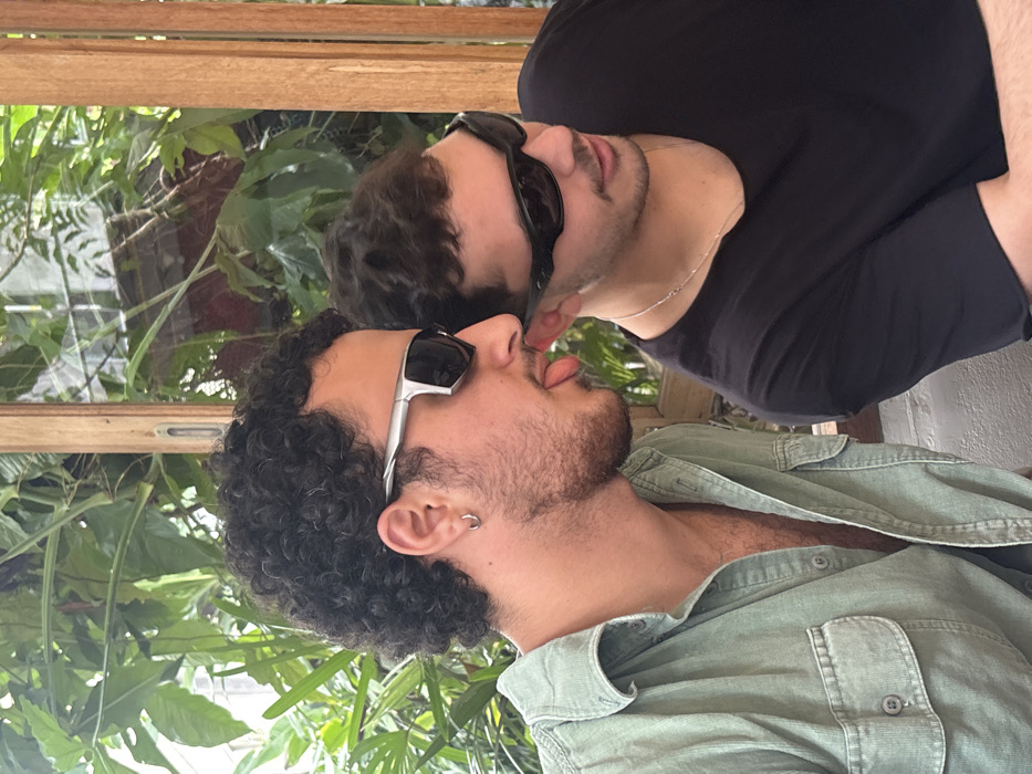 Two men, facing different directions, are close together. The man in the foreground has curly dark hair, a beard, and wears silver sunglasses and an olive-green shirt. He's sticking his tongue out. The other man has dark hair, a dark t-shirt, dark sunglasses and is wearing a silver chain. Green plants are visible in the background, along with wood frames.