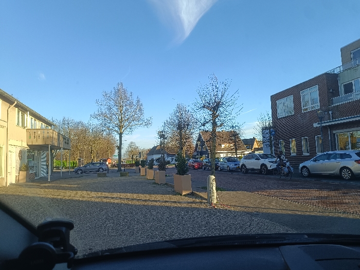 The image provides a forensic view of an urban street scene in Rheden, Netherlands, observed from inside a vehicle. The immediate foreground displays a vehicle dashboard with a black mounting device, overlooking a light-colored, granular ground surface that transitions to a patterned brick roadway. The sky overhead is clear and bright blue, featuring a single, elongated wispy cloud in the upper left quadrant. On the left side of the scene, a light-colored, multi-story building with a flat roof is visible. It features several windows and a prominent second-story balcony with railings. A glass entrance door is apparent on the ground floor, flanked by large, light-colored square planters. Beyond this building, a dense cluster of bare deciduous trees and a parked dark grey sedan are present. The central area of the image shows a paved expanse containing a line of similar light-colored planters and several bare deciduous trees. A light-colored bollard stands in the mid-ground. Further back, various buildings, including residential structures with sloped roofs, are visible, accompanied by a line of parked automobiles extending into the distance. To the right, a multi-story building constructed of brick, topped with a dark tiled roof, displays large windows with white frames. An upper section of this building presents a lighter facade. Several vehicles are parked along the street adjacent to this structure, including a silver station wagon in the foreground and a white SUV behind it. One individual is seen on a dark-colored bicycle, positioned next to the white SUV.