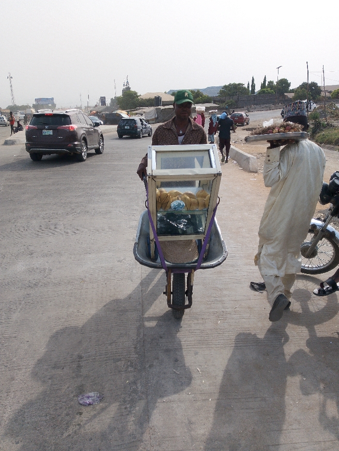 A vendor pushes a wheelbarrow containing a glass display case filled with baked goods. He wears a printed shirt and a baseball cap. Beside him, another vendor walks with a tray balanced on his head, clad in a long, light-colored robe. The scene is set on a paved road, with cars driving by in the background. The shadows of the people are cast prominently on the road surface.