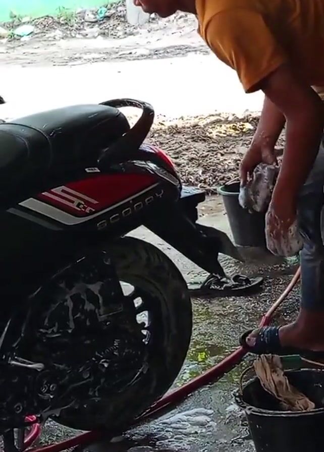 - "A young man wearing a yellow shirt and dark pants is diligently washing the rear tire of a black and red Scoopy motorcycle" by FM-rCrtE3, licensed under CC BY 4.0