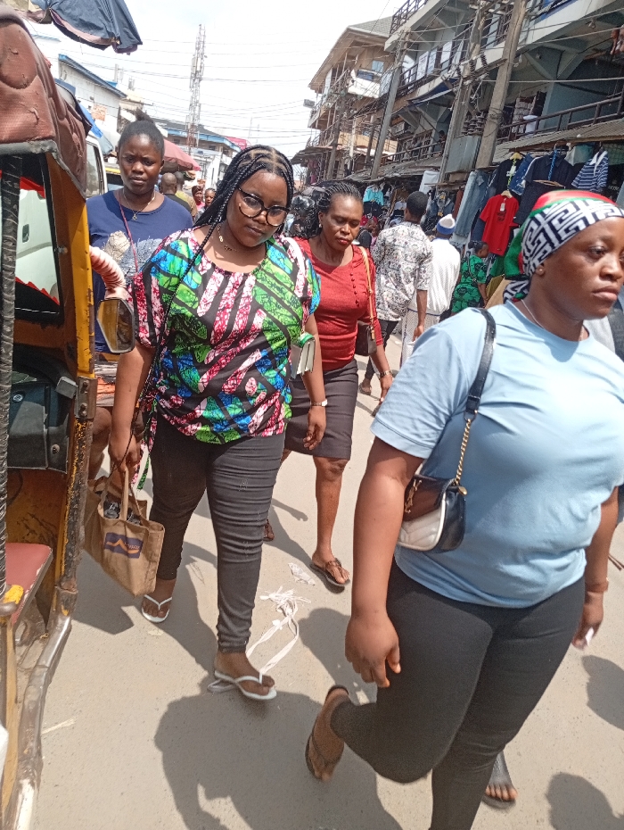 A bustling market scene features several people walking. A woman in a colorful top and black leggings is in the foreground, holding a shopping bag and wearing glasses. A woman in a red top is nearby. Another woman with a headscarf wears a blue top. They are all wearing sandals. Clothes hang from stalls in the background. Part of a motorized tricycle is visible on the left side of the image. The scene is bathed in sunlight.