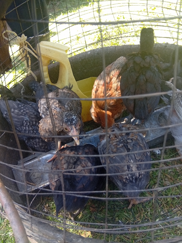 The image displays a group of at least seven juvenile chickens confined within a cylindrical metal wire mesh enclosure