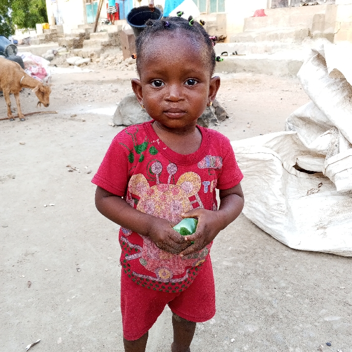 A young, dark-skinned child in a red shirt and shorts stands on a sandy ground. The child holds a green object, possibly a fruit or vegetable. Behind the child are a goat, white bags or containers, and a building with steps. The child has small earrings and colorful decorations in their hair. The overall setting suggests a rural or less developed area.