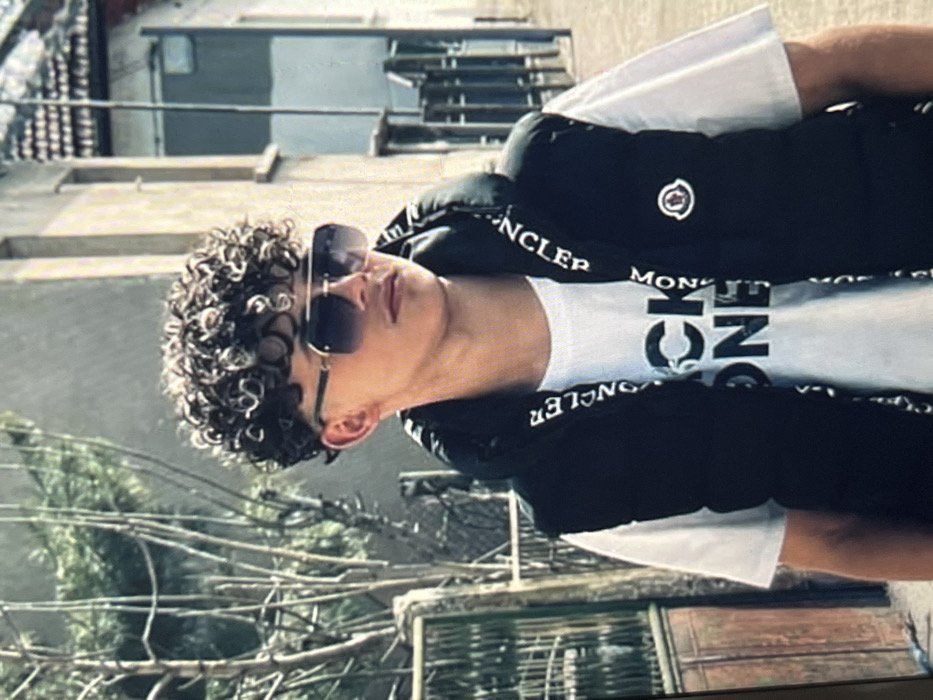 An image depicts a young male standing outdoors in Krivodol, Bulgaria. The subject has dark, tightly coiled curly hair, faded on the sides. He wears large, square-framed aviator-style sunglasses with dark lenses and gold-colored frames. He is dressed in a white short-sleeved t-shirt, which has partially visible dark lettering on the chest, possibly "CK ONE." Over the t-shirt, he wears a black sleeveless puffer vest. The vest features the word "MONCLER" repeatedly printed on the inner collar/hood lining, and a circular Moncler logo patch is visible on the left chest. The subject is looking slightly to his right, away from the camera. The background on the left consists of bare tree branches and a dark metal gate with a wooden panel behind it. On the right, a light-colored building with visible window frames and a roofline is present, indicative of an older architectural style. The scene is illuminated by natural daylight.