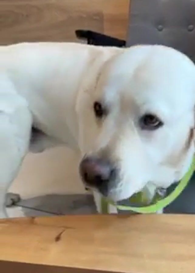A close-up shot shows a light-colored Labrador Retriever sitting inside. The dog has a green leash in its mouth, and its head is just above the level of a wooden table. An adult can be seen sitting in the background to the right, holding the other end of the leash. The background includes tiled flooring and light wood paneling on the walls.