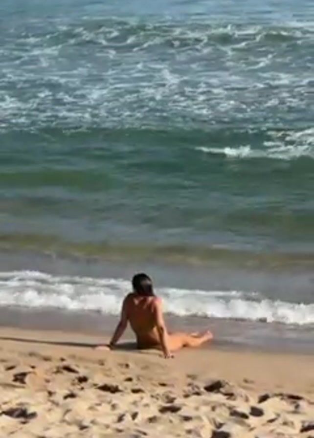A lone woman sits on a sandy beach facing a tranquil ocean. She is wearing a tan bikini and has dark hair. The waves gently lap at the shore near her. The environment is sunny, creating a peaceful, summery vibe. The scene captures a moment of relaxation and solitude by the sea.
