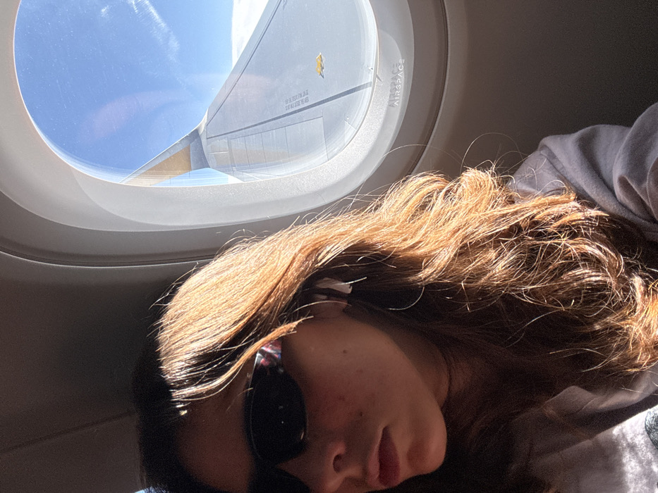 The scene is inside an aircraft in flight, with the operational context linked to the city of Unknown, Israel. A female passenger, partially visible on the left, has long, wavy brown hair, illuminated by bright sunlight. She is wearing dark, rectangular sunglasses with patterned temple arms and a silver-colored ear cuff with multiple bands on her visible left ear. Through an oval airplane window on the right, a portion of a grey aircraft wing is visible against a clear blue sky with white clouds below. The wing features a partially visible gold-tipped winglet and legible markings including "AIRSPACE" and "APU-ACC", along with a yellow rectangular sticker.