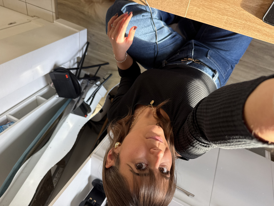 A woman in a black ribbed long-sleeve shirt and blue jeans takes a selfie. She sits at a wooden desk with her hand raised. She wears gold hoop earrings, a delicate necklace, and rings. The background includes a white cabinet with drawers open, revealing various items inside. A black bag rests on a chair next to the cabinet. The floor appears to be wood.