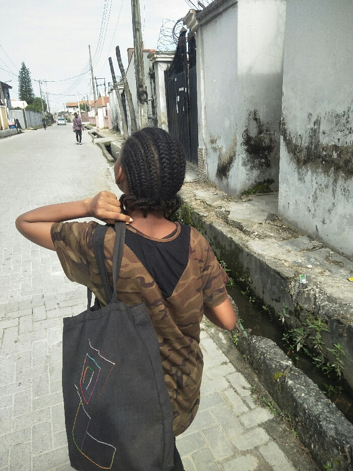 An image captured in Iranla, Nigeria, depicts an individual walking on a paved street. The primary subject is a person, viewed from behind, wearing a camouflage-patterned short-sleeved shirt with a black underlayer and carrying a black tote bag adorned with a multi-colored linear geometric design over their left shoulder. Their hair is styled in dark cornrows, pulled back. The individual is walking on a light-colored paver sidewalk next to a concrete drainage ditch containing murky water and green vegetation. To the right, a grey concrete wall shows dark stains and moss, leading to a dark metal gate topped with barbed wire. In the background, a paved road stretches into the distance, where another individual in a plaid shirt walks. Several utility poles with overhead lines are visible. Other light-colored buildings and sparse greenery line the street, with an overcast sky overhead. A white vehicle is partially visible further down the road.