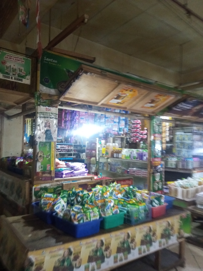 A small sundry store or shop exhibits an array of merchandise. Notable products include numerous bags of "Mama Suka" brand items in blue and green baskets, along with shelves filled with various food products and household items. Advertisements for "Santan" and "Sasa Santan" are prominently displayed, indicating a focus on coconut milk products. The store's sign reads "Toko H. Ujang."