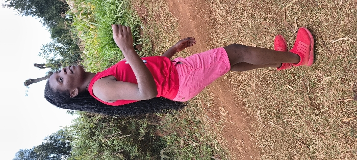 An adult female is depicted standing outdoors on an upward-sloping terrain, identified as Getenga ward, Kenya. The individual has dark skin and long, dark braided hair styled into a high ponytail extending down her back. She is dressed in a red sleeveless top, pink shorts, and bright red athletic shoes. Her right arm is slightly bent, with the hand raised to chest level and fingers lightly curled. She is oriented towards the right side of the frame, looking upwards. The ground beneath her feet consists of reddish-brown soil mixed with sparse, dry-looking grass. The background features dense green foliage, including bushes, trees with visible stumps or pruned branches, and areas of lighter green vegetation consistent with crops. The sky overhead is light and appears overcast.