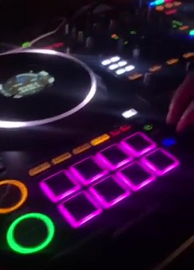 DJ manipulating a DJ controller in a dark environment. The controller has two turntables with illuminated rings, several lit buttons in various colors (pink, orange, green, yellow, white, blue), and multiple faders and knobs. A hand is seen operating a few of the controls on the right side of the controller. The background is blurred but hints at people and red lighting, suggesting a club or party atmosphere. The camera angle is slightly elevated and static. The overall focus is on the illuminated DJ controller and the DJ's hands.