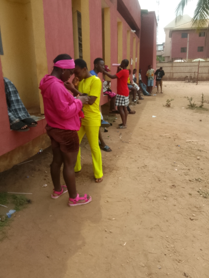 The image depicts an outdoor scene in Umuokpu, Nigeria, adjacent to a building with reddish-pink walls and vertical yellow-ochre accents. The ground consists of reddish-brown dirt. In the foreground, two individuals are standing. The person on the left wears a hot pink hooded sweatshirt, brown shorts, a pink headband, and pink sandals; they are looking down. The person on the right wears a bright yellow top and matching trousers with brown sandals; they are also looking down and appear to be interacting closely with the first individual, their hands near each other. A black and white plaid garment is draped over a low ledge to the far left. Further along the building's wall, several other individuals are present. One person in a red t-shirt and black-and-white checkered shorts stands, holding a pink cylindrical object near another person's face. Other figures are seated or standing along the wall, some appearing to rest. In the background, a brown metal fence separates the dirt area from a multi-story brown building with a light-colored roof. Sparse green vegetation is visible on the dirt ground and a palm frond extends into the upper right corner.
