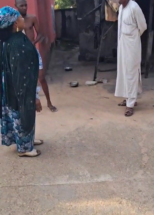 A woman in traditional African clothing is speaking to a shirtless young man in a courtyard with a man in a white robe standing nearby with his hands behind his back. The courtyard is concrete and there is a red building with a satellite dish attached. There are also some bowls on the ground. The woman gesticulates as she speaks to the young man.