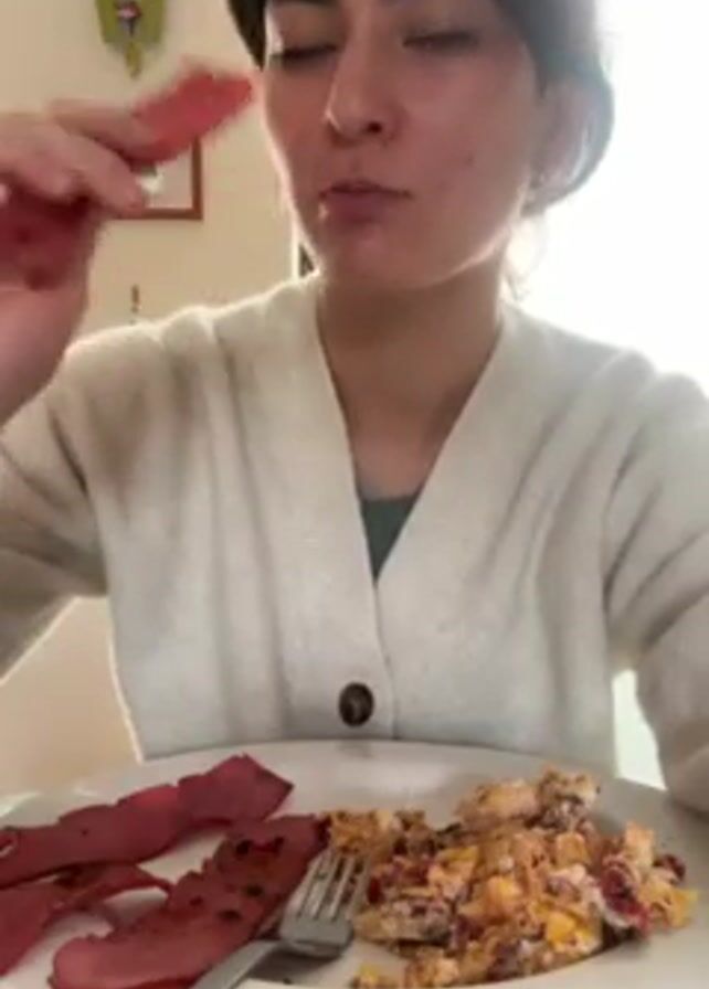 A person is seated and eating breakfast. The individual has dark hair and is wearing a white cardigan over a green shirt. They pick up a strip of pink food, possibly turkey bacon or a meat substitute, and eat it. A white plate in front of them contains the strips of pink food and what appears to be scrambled eggs with other ingredients. A fork rests on the plate. The background is bright, and a wall is visible with a framed picture and a decorative green object hanging on it. The person appears to be looking at the camera while eating.