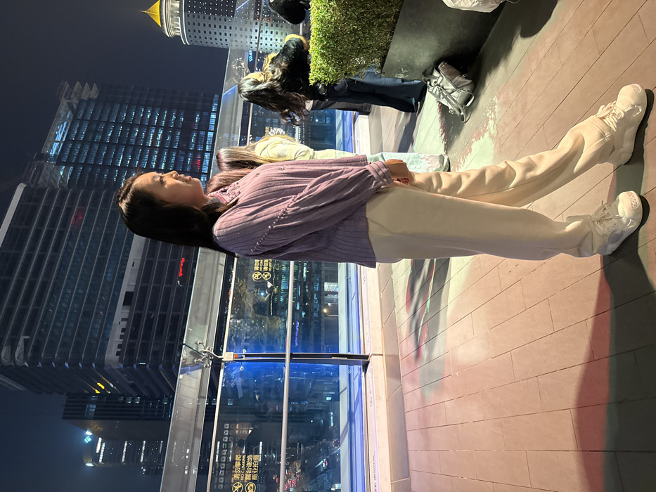 The scene is an elevated outdoor viewing platform at night in Chaoyang District, China, overlooking a dense urban cityscape. In the foreground, a light-skinned East Asian female stands in profile, facing right. She wears a long-sleeved, ribbed, light purple shirt with pearl-like embellishments along the front placket and cuffs, light beige wide-leg trousers, and chunky white athletic shoes. Her dark hair is styled down. Her hands are positioned at her sides. Behind her, a transparent glass railing with metallic supports extends horizontally across the frame. Affixed to the glass are multiple white-on-black signs indicating "NO CLIMBING" and "NO COMMERCIAL PHOTOGRAPHY" in both English and Chinese characters. Below the railing, vehicle lights are visible on a street. Further back, partially obscured by the foreground subject and the railing, are at least two other individuals. One, an East Asian female, is visible from the back, wearing a light-colored top and patterned pants. Another East Asian female is to her right, mostly obscured by a dark rectangular planter containing manicured green shrubs, wearing a dark top. A silver or light gray backpack is on the paved ground to the right of the central figures. The ground is paved with rectangular light-colored tiles, displaying reflections of red and blue light. The background features numerous illuminated high-rise buildings, characteristic of a modern business district. A prominent building on the right side of the frame possesses a distinctive golden domed roof. The sky is dark.