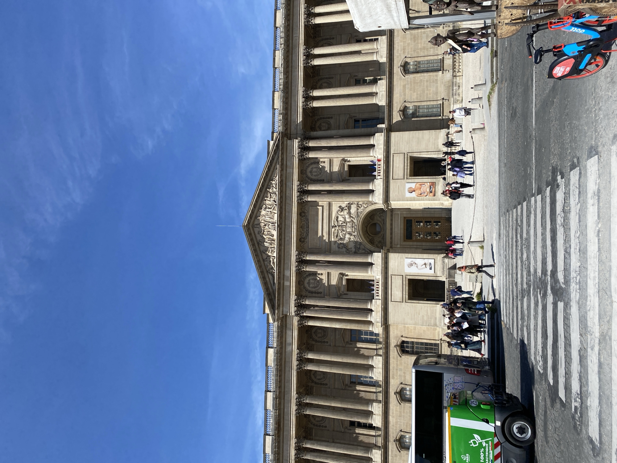 The image depicts the façade of the Louvre Museum in Paris, France, under a clear blue sky. The museum's architecture is characterized by classical elements such as columns and a pediment. A group of people are queuing near the entrance, while a bus and several bicycles are parked alongside the street. A zebra crossing is visible in the foreground.
