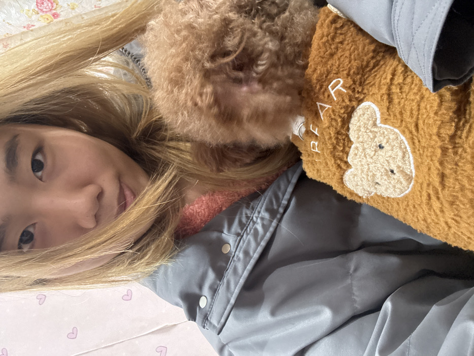 A person with blonde hair poses with a brown poodle wearing a brown bear-themed coat. The person wears a gray jacket over a pink sweater. The coat has the word "BEAR" embroidered on it. The background features a bedspread with pink heart patterns and a floral design. The photo is taken from a close-up, slightly tilted angle.