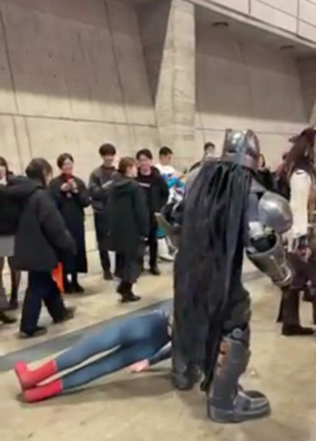 The scene depicts a crowded convention hall with people in various costumes. In the foreground, a person is lying on the floor, dressed as Spider-Man. Nearby, cosplayers dressed as the Mandalorian and Jack Sparrow walk past, seemingly unconcerned. Other people in costumes, as well as attendees in casual clothing, mill around in the background. The hall has a neutral concrete floor and walls. An audio announcement can be heard playing over the sound system.