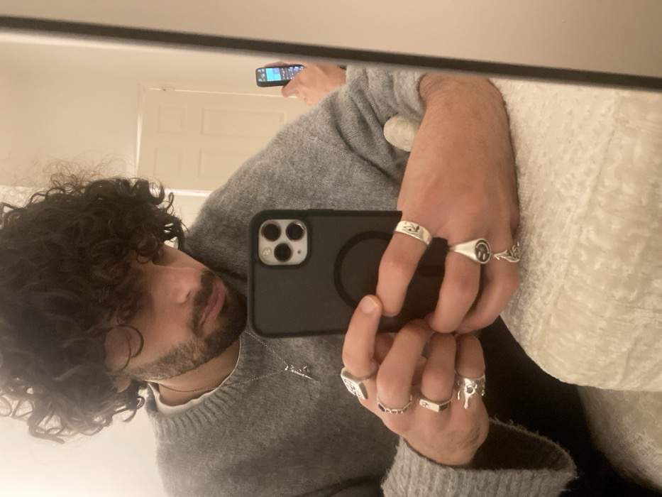 A male individual with dark, curly hair and a beard takes a mirror selfie in an indoor setting. He wears a light gray knitted sweater over a white undershirt and a silver necklace with a stylized pendant. His hands, adorned with multiple silver rings (including designs such as a skull, a hexagonal shape, an eye symbol, and a smiley face signet with a dangling charm), hold a black smartphone with a triple-lens camera and a circular accessory on its back, obscuring the lower half of his face. His gaze is directed downwards. In the reflection behind his right shoulder, a hand is visible holding a black feature phone. A light-colored, textured padded surface occupies the foreground. The background features plain light-colored walls and a white interior door with a handle. No visual information within the image identifies the location as New York, United States.