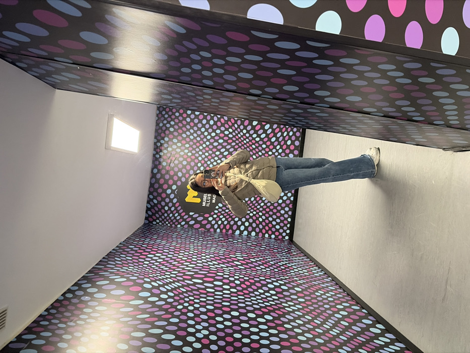 - "A person wearing a jacket, jeans, and sneakers holds a phone to take a picture in a room with optical illusion decor" by FM-u4bA12, licensed under CC BY 4.0