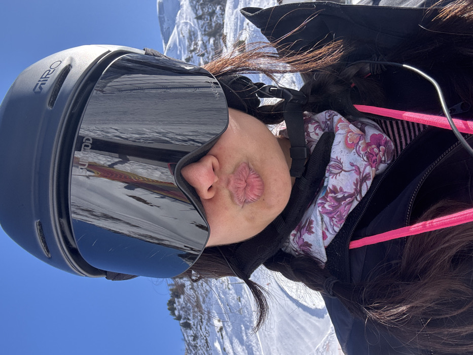 A close-up image depicts an individual on a ski slope in Zürs, Austria. The person is wearing a black Giro ski helmet and large, black mirrored ski goggles branded "SUNDOGG" and "KOSKI". These goggles reflect a snow-covered ski slope, including a portion of a multi-colored structure and ski tracks. The individual's lips are pursed in a pout, positioned above a patterned neck gaiter featuring white, pink, and purple floral designs. Dark braided hair is visible extending from beneath the helmet. A black jacket with a prominent pink zipper pull tab is worn over a striped garment. The background consists of a clear blue sky and distant snow-covered mountains with discernible ski paths.