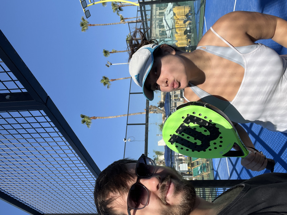 A man and a woman are depicted in a close-up selfie on an outdoor padel court located in Raanana, Israel