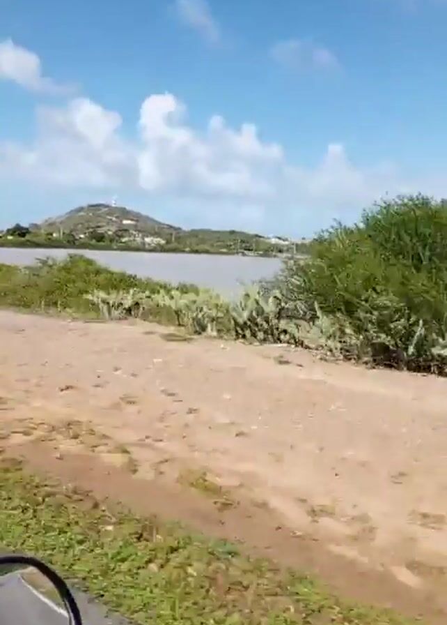 The video depicts a view from a moving vehicle, likely a motorcycle, on a road next to a body of water. The water is bordered by green vegetation and a dirt area. In the distance, there are low hills with some buildings visible on one hill. The sky is blue with scattered white clouds. The road has a white line marking the edge. The vehicle's side mirror is visible in the lower left corner. The vegetation appears to be sparse and somewhat scrubby. The overall scene gives the impression of a rural or coastal landscape.