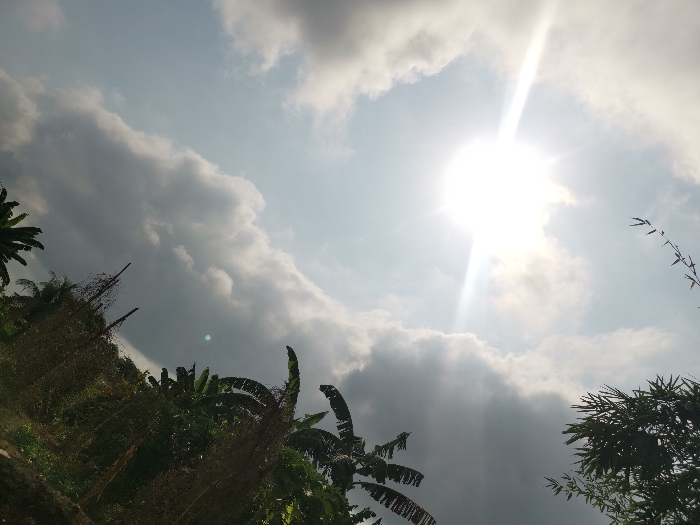 A photograph captures an upward-facing view of the sky and tropical vegetation, likely taken outdoors in Owa-Alero, Nigeria. The upper right quadrant features a prominent, brilliant white sun, exhibiting significant lens flare and radiant sunbeams that pierce through the surrounding clouds. The sky is characterized by a blend of clear light blue and extensive formations of grey and white cumulus clouds, particularly dense across the mid-ground and left, indicating partially overcast conditions. The lower half and left side of the image are dominated by dense, verdant foliage. Recognizable plant species include broad-leafed banana plants in the lower center and mid-left, and slender, upright stalks consistent with bamboo on the far right and extending from the lower left. No human subjects, animals, or artificial structures are visible within the frame. The scene is illuminated by strong natural sunlight, creating discernible contrasts between the bright sky and the shadowed vegetation.