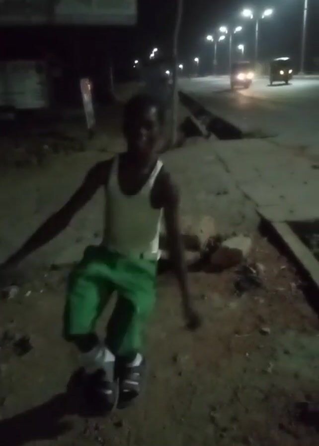 A person wearing a white tank top, green shorts, and white socks stands on a dirt patch near a sidewalk on a street lit by streetlights. The person moves in what appears to be dance, then the camera moves abruptly as another person steps towards the camera. The video is taken at night. Cars are seen driving on the street.