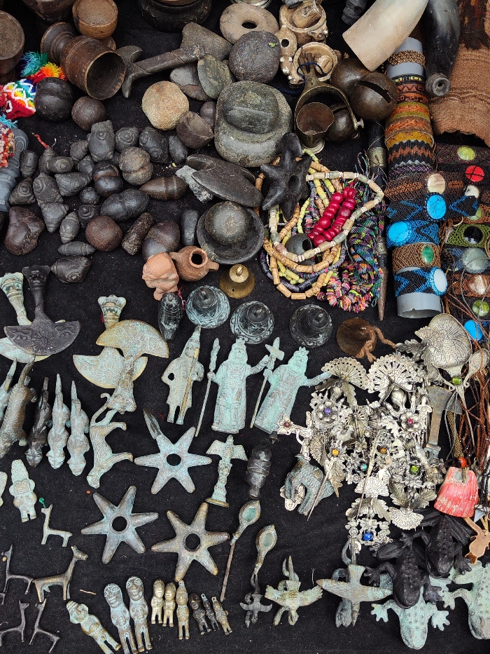 An assortment of artifacts and trinkets are laid out on a black surface. Rustic pottery, stone tools, and beaded jewelry occupy the upper portion. Below, patinated bronze figurines depicting animals, stars, and human figures are arranged. A cluster of silver-colored, ornate jewelry with embedded stones sits alongside the bronze, featuring designs of hands and crosses. At the edge, decorative woven wristbands with colorful embellishments are present.