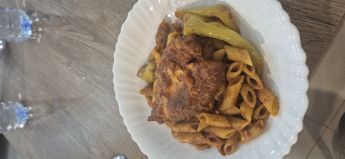 A close-up, slightly overhead view displays a prepared meal on a light brown wood-grain table in Tixeraïne, Algeria. The central subject is a white ceramic plate with a scalloped rim, holding a serving of penne pasta coated in a reddish-orange sauce. Resting atop the pasta is a piece of reddish-brown, seasoned chicken. To the right of the chicken and pasta are several green, elongated vegetables. In the blurred upper background, two clear plastic water bottles with blue caps are visible. No individuals or active interactions are depicted within the frame.
