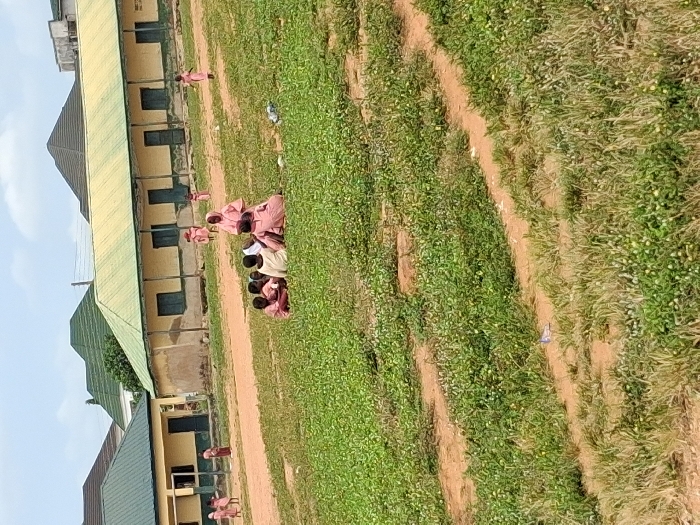 This image depicts an outdoor scene in the city of Donga, Nigeria. In the foreground and midground, a patchy field of green grass with exposed reddish-brown dirt paths occupies the majority of the frame. Scattered small debris, including a light blue plastic item, is visible on the ground. In the midground, a group of approximately six to seven individuals, primarily children, are seated on the grass in a semi-circle. Most are wearing light pink or peach-colored long-sleeved garments that appear to be uniforms. One individual in the center of the group, facing away from the camera, appears to be holding and possibly reading from an open book or notebook. Another individual, taller and also in a pink garment, stands behind this seated group. In the background, two single-story school-like buildings with light-colored (cream or faded yellow) facades and prominent green corrugated metal roofs are visible. The building on the right shows signs of weathering, including exposed concrete and dirt stains on its lower walls. Both buildings feature multiple dark-colored doors and rectangular windows. Several other children, also in similar pink or peach uniforms, are visible standing or walking in the dirt area between the seated group and the buildings. Beyond these structures, additional residential buildings with darker green roofs are partially visible against an overcast sky.